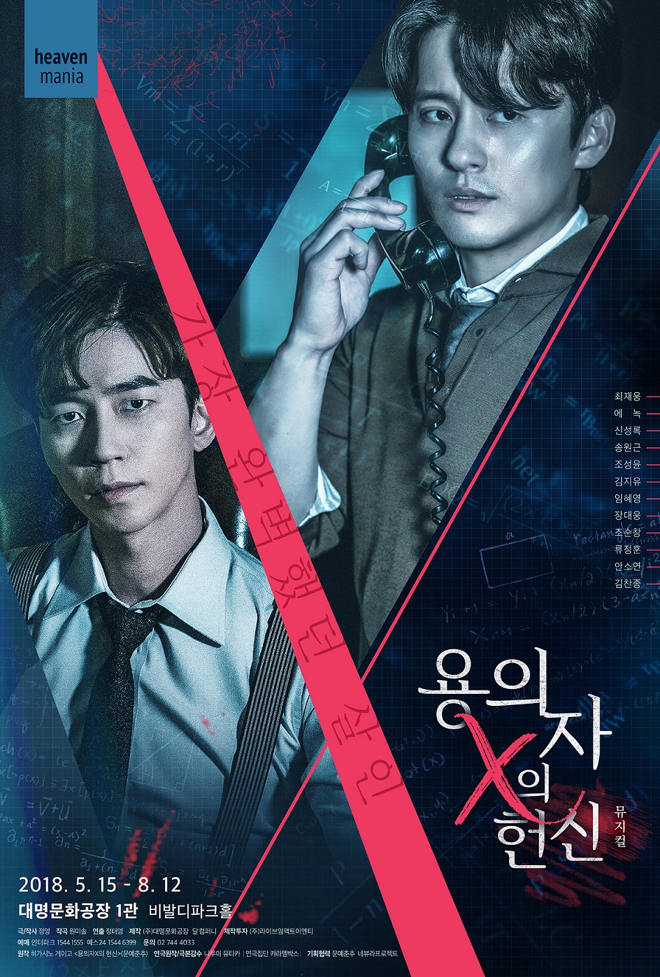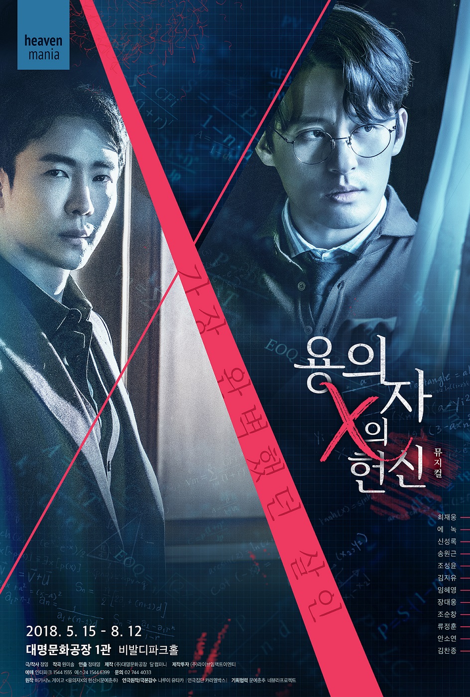 사건을 은폐하기 위해 철저히 알리바이를 계획하는 천재 수학자 이시가미 역의 최재웅과 조성윤은 흐트러짐 없는 감정선으로 공연의 마지막까지 긴장의 끈을 놓을 수 없도록 극을 이끌었으며, 사건을 진실을 밝혀내기 위해 숨은 진실을 파헤치는 천재 물리학자 유카와 역의 에녹, 신성록, 송원근은 트리플 캐스팅으로 같은 역할이지만 각기 다른 매력으로 캐릭터를 소화하며 여심을 자극했다. 지우고 싶은 과거와 살인이라는 어두운 굴레 속에서 하나뿐인 딸 미사토를 위해 삶을 살아가는 야스코 역의 김지유와 임혜영의 연기력 또한 극을 더욱 몰입하게 만들었다.