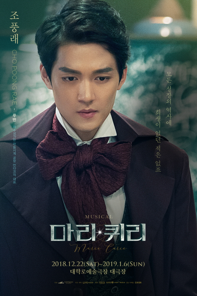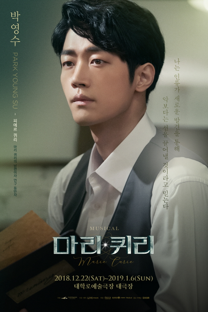 마리 퀴리의 연구 동반자인 피에르 퀴리 역의 박영수와 라듐사업으로 자수성가한 루벤 역을 맡은 조풍래는 굳은 의지가 담긴 눈빛으로 극 중 라듐의 위해성으로 대척점에 서게 되는 캐릭터를 완성했다. 이어 포스터에 삽입된 “나는 인류가 새로운 발견을 통해 악보다는 선을 끌어낼 것이라고 믿는다”라는 피에르 퀴리의 대사와 “모든 성장의 역사에 희생이 없던 적은 없죠”라는 루벤의 대사는 서로의 목적을 관철시키고자 하는 피에르 퀴리와 루벤 관계성을 드러내 기대감을 증폭시켰다.
