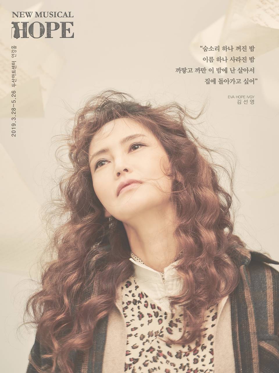 티켓오픈을 앞두고 이번에 공개된 포스터는 타이틀롤인 호프를 담고 있다. 두 가지 버전으로 공개된 포스터에는 전쟁의 한 가운데서 행복했던 과거를 회상하며 집으로 돌아가고 싶었던 호프의 바람과 자신의 삶을 외면하는 것으로 스스로를 벌주던 호프에게 다시 시작할 수 있다는 응원까지, 호프의 과거와 현재를 짐작할 수 있는 가사들로 꾸며졌다. 여기에 각기 다른 느낌으로 캐릭터를 해석한 김선영과 차지연의 깊은 눈빛이 더해져 ‘HOPE’에 대한 궁금증을 더하고 있다.