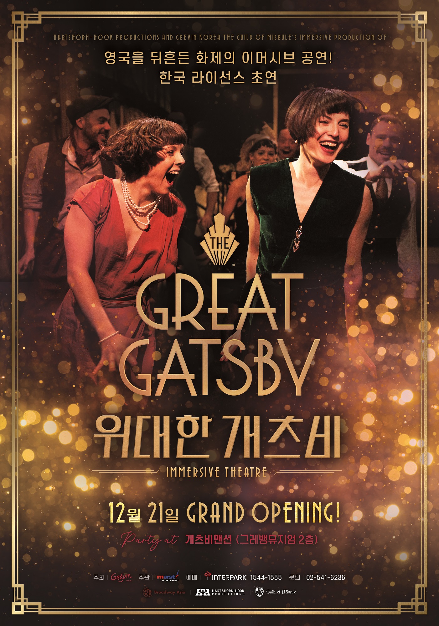 최근 전세계적으로 열풍을 불러 일으킨 트렌디 장르, 이머시브 공연 ‘위대한 개츠비’가 지난달 국내 처음으로 라이선스 공연을 개막해 관객들의 입소문을 타고 2020년에도 뜨거운 흥행 돌풍을 이어가고 있다. ‘위대한 개츠비’는 F. 스콧 피츠 제럴드가 쓴 동명의 고전 소설을 원작으로 각색한 작품으로 객석과 무대가 분리되는 전통적인 프로시니엄 공연장에서 벗어나, 1920년대 미국의 화려한 황금기이자 재즈시대를 느낄 수 있도록 재현된 공간에서 무대와 객석의 구분없이 관객과 배우가 직접 소통하며 현장성과 즉흥성을 추구하는 관객 참여형 공연이다. 새롭고 신선한 형태의 공연으로 관객이 배우와 긴밀하게 소통하고, 극 중 이야기의 일부가 되어 참여하며 더욱 깊은 공감대를 이끌어낸다. ‘위대한 개츠비’는 2월 28일까지 개츠비맨션(그레뱅 뮤지엄 2층)에서 공연되며, 쏟아지는 관객과 평단의 호평 속에 국내 공연계 새로운 패러다임을 제시하고 있다.