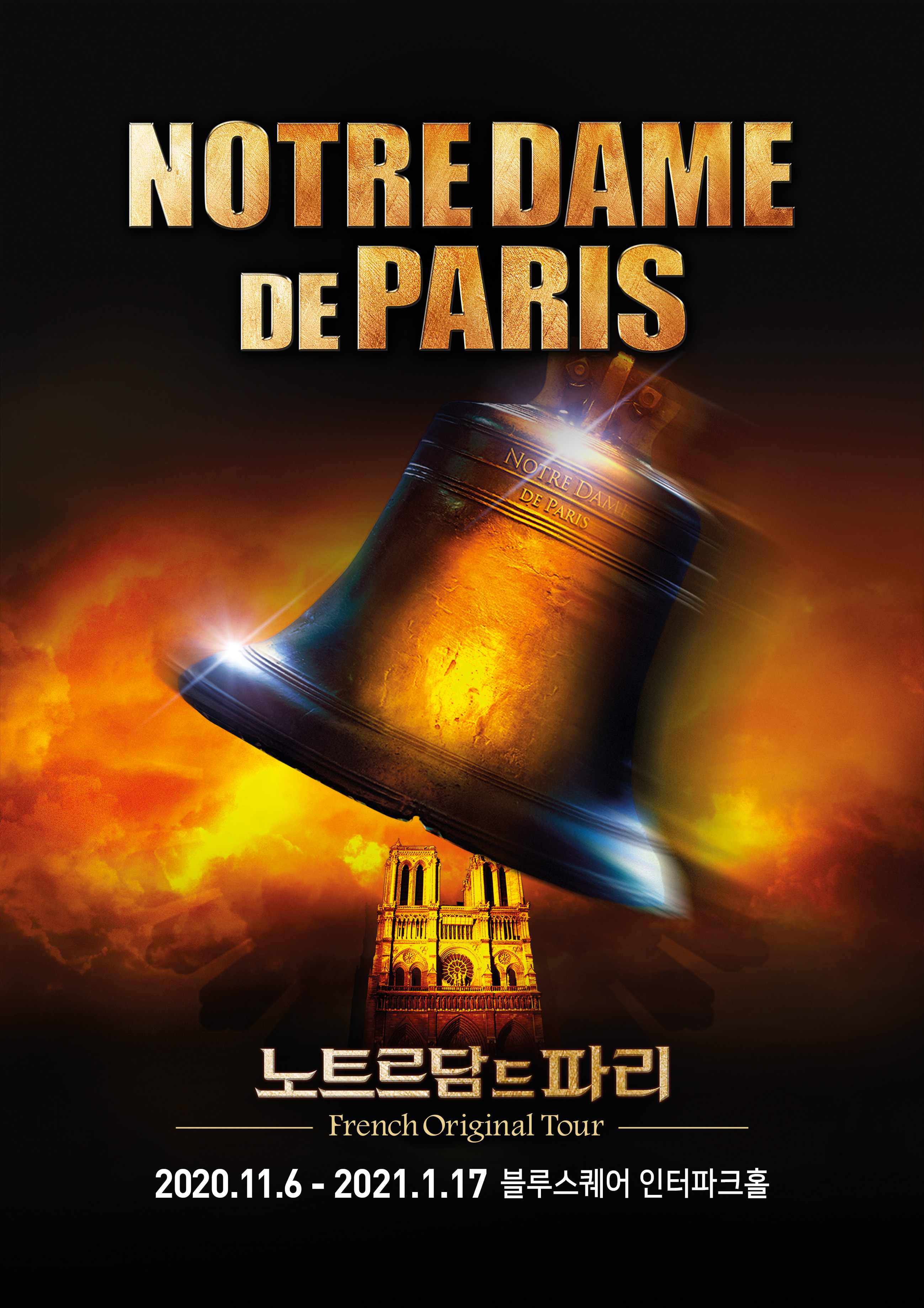 프랑스의 국민 뮤지컬이자 전세계 뮤지컬 흥행 신화를 이룬 베스트 셀러 뮤지컬 ‘노트르담 드 파리’의 오리지널 프렌치 투어 공연이 돌아온다. 이번 시즌은 프렌치 투어의 국내 15주년 기념 공연으로 오리지널 프렌치 공연의 20주년을 맞이해 선보였던 뉴 프로덕션 버전이다. 빅토르 위고가 쓴 동명의 고전 명작을 원작으로 만들어진 ‘노트르담 드 파리’는 탄탄한 스토리를 바탕으로 아름다운 선율과 어우러진 시적인 노랫말, 무대를 가득 채우는 역동적인 안무가 어우러져 관객들의 마음을 사로잡았다. 1998년 프랑스 파리 초연부터 현재까지 오리지널 크리에이터들이 전세계 프로덕션에 직접 참여해 언어와 문화의 장벽을 뛰어 넘어 ‘노트르담 드 파리’만의 작품성을 인정받아왔다. 국내에서도 20개 도시에서 100만 누적 관객 수를 돌파할 만큼 선풍적인 인기를 끌며 꾸준히 사랑받고 있다. 20여 년의 노하우가 집약된 ‘노트르담 드 파리’ 뉴 프로덕션은 11월 6일부터 2021년 1월 17일까지 블루스퀘어 인터파크홀에서 공연되며, 그에 앞서 10월 중순에는 부산 공연이 진행될 예정이다. 또한 서울 공연 이후에는 대구 등 지방 공연을 예정하고 있다.