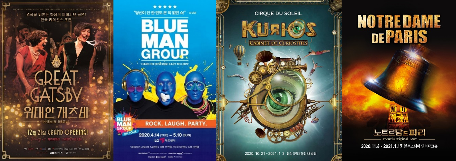 ㈜마스트엔터테인먼트가 2020년 라인업을 공개했다. 현재 인기리에 공연 중인 국내 초연 라이선스 ‘위대한 개츠비’를 비롯해 ‘블루맨 그룹’, 태양의서커스 ‘큐리오스’, ‘노트르담 드 파리’ 등 대형 작품들의 내한 공연이 이어질 예정이다.