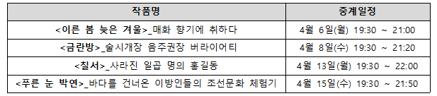 온라인 스트리밍 대상 작품은 2013년 이후 제작된 창작가무극 중 레퍼토리화 되지 않아 극장에서 다시 관람하기 어려운 작품 9편을 대상으로 온라인 설문을 통해 4편의 작품을 선정했다. 3월 25일부터 29일까지 ’네이버폼‘을 통해 투표로 선정, 관객들의 의견을 적극적으로 반영한 데에 큰 의미가 있다. 관객 투표를 통해 선정된 4작품은 ’푸른 눈 박연’(2013), ‘이른 봄 늦은 겨울’(2015), ‘칠서’(2017), ‘금란방’(2018) 이며, 공연실황 녹화 중계를 통해 그동안 극장에서 만나기 어려웠던 작품을 누구나 무료로 관람할 수 있어 큰 기대를 모으고 있다.