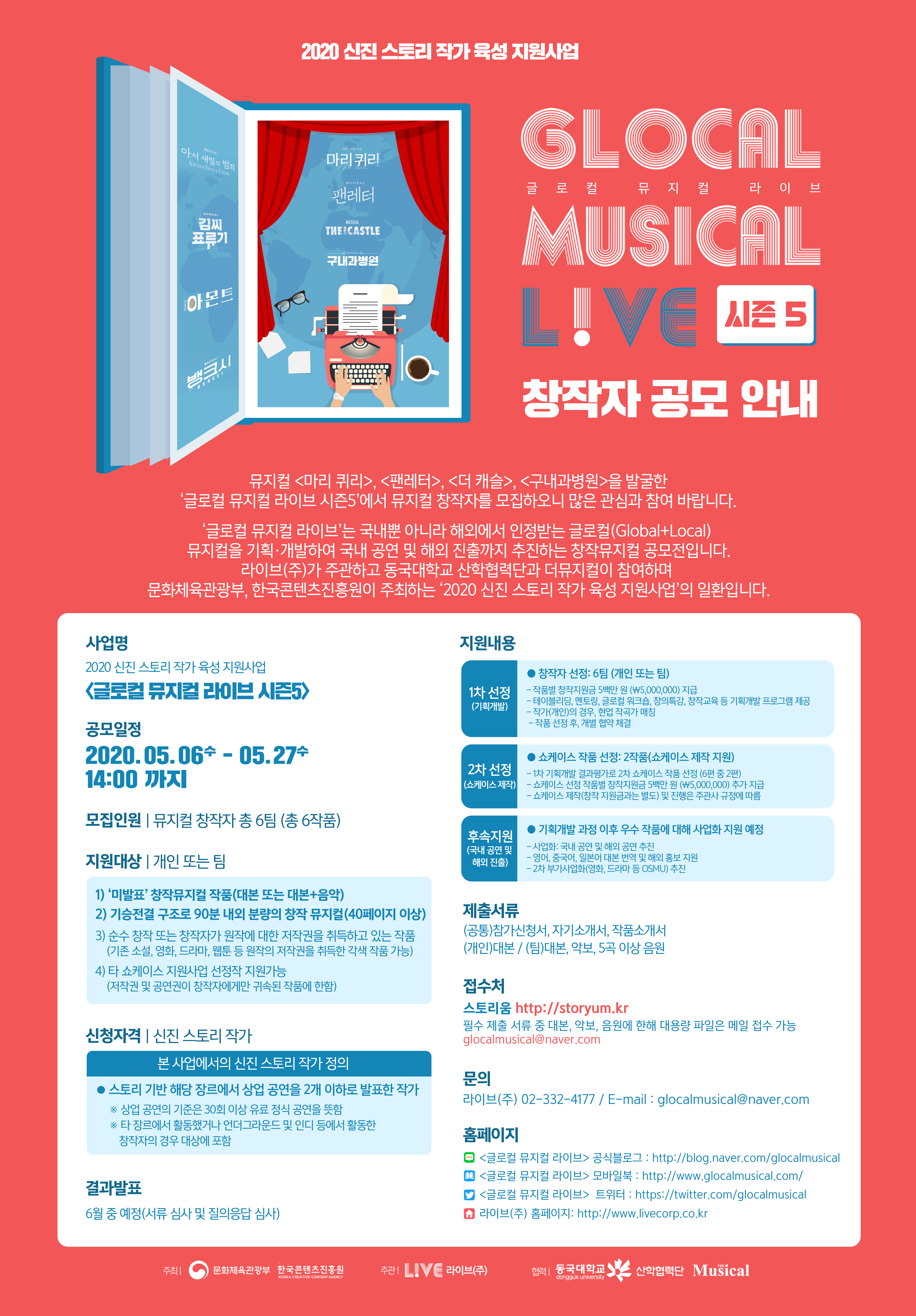 공연제작사 라이브㈜가 주관하는 ‘글로컬 뮤지컬 라이브’ 시즌5는 문화체육관광부, 한국콘텐츠진흥원이 주최하고 동국대학교 산학협력단과 더뮤지컬이 참여한다. 신청 접수는 5월 6일부터 5월 27일까지 약 3주간 진행된다.
