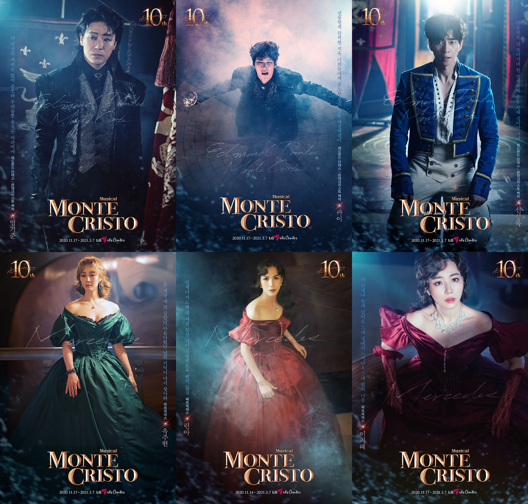 25일 뮤지컬 ‘몬테크리스토’의 제작사 EMK뮤지컬컴퍼니(이하 EMK)측이 10주년 기념 공연의 영광스러운 무대에 오를 ‘에드몬드 단테스/몬테크리스토 백작’과 ‘메르세데스’ 역을 맡은 6명의 캐릭터 포스터를 공개하며 최종 라인업을 완성했다.