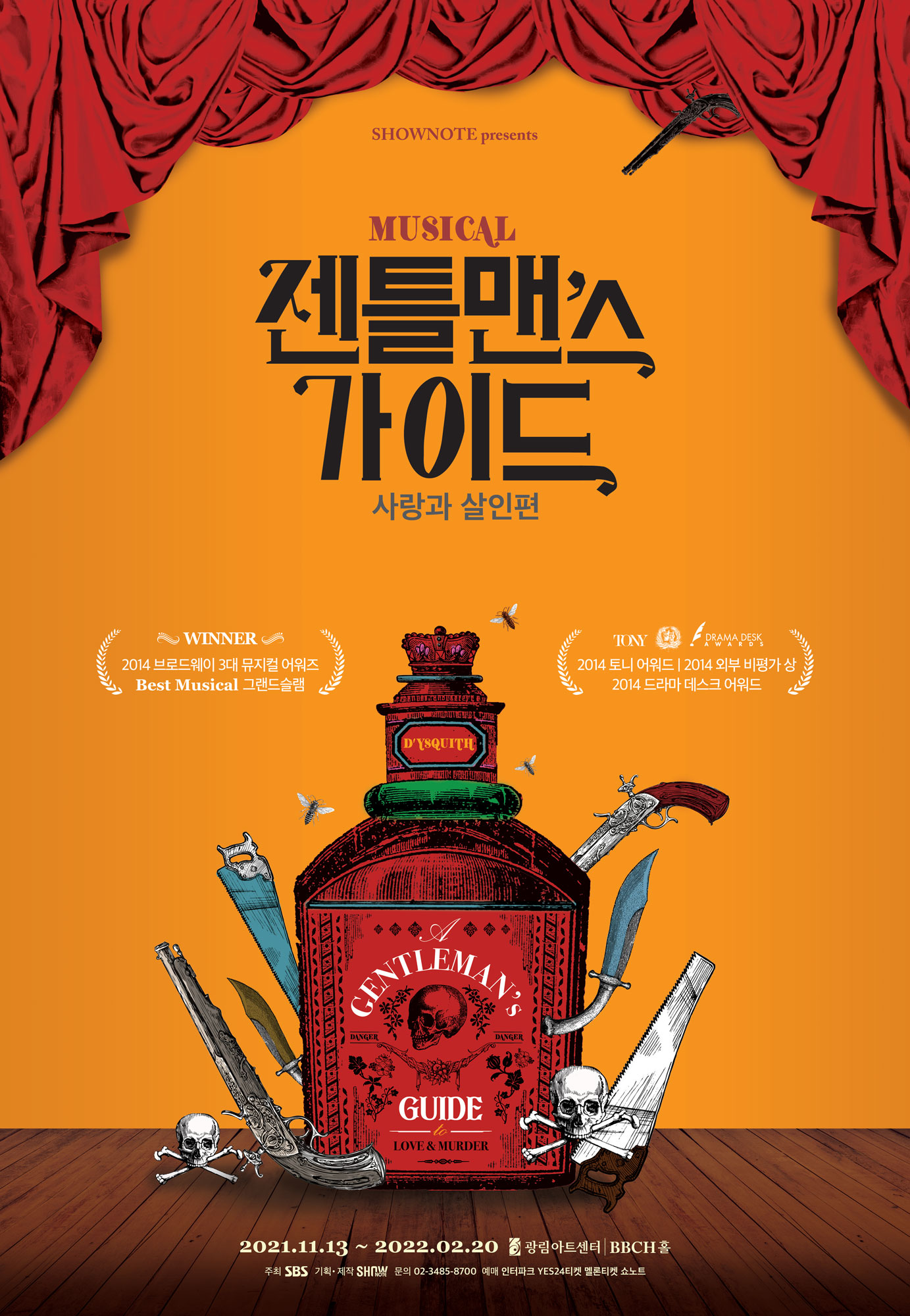 ‘젠틀맨스 가이드: 사랑과 살인편’은 미국에서 2012년 초연된 이후 토니 어워드, 드라마 데스크 어워드, 외부비평가협회상, 드라마리그 어워드 등 브로드웨이의 4대 뮤지컬 어워즈에서 ‘최우수 뮤지컬’ 상을 비롯하여 총 16개의 상을 수상하며 작품성을 인정받은 바 있다. 한국에서는 2018년 초연되었으며, 같은 해 아시아컬처어워드 작품상과 남자주연상, 한국뮤지컬어워즈에서 남자조연상과 무대예술상 무대디자인상을 수상하기도 했다.