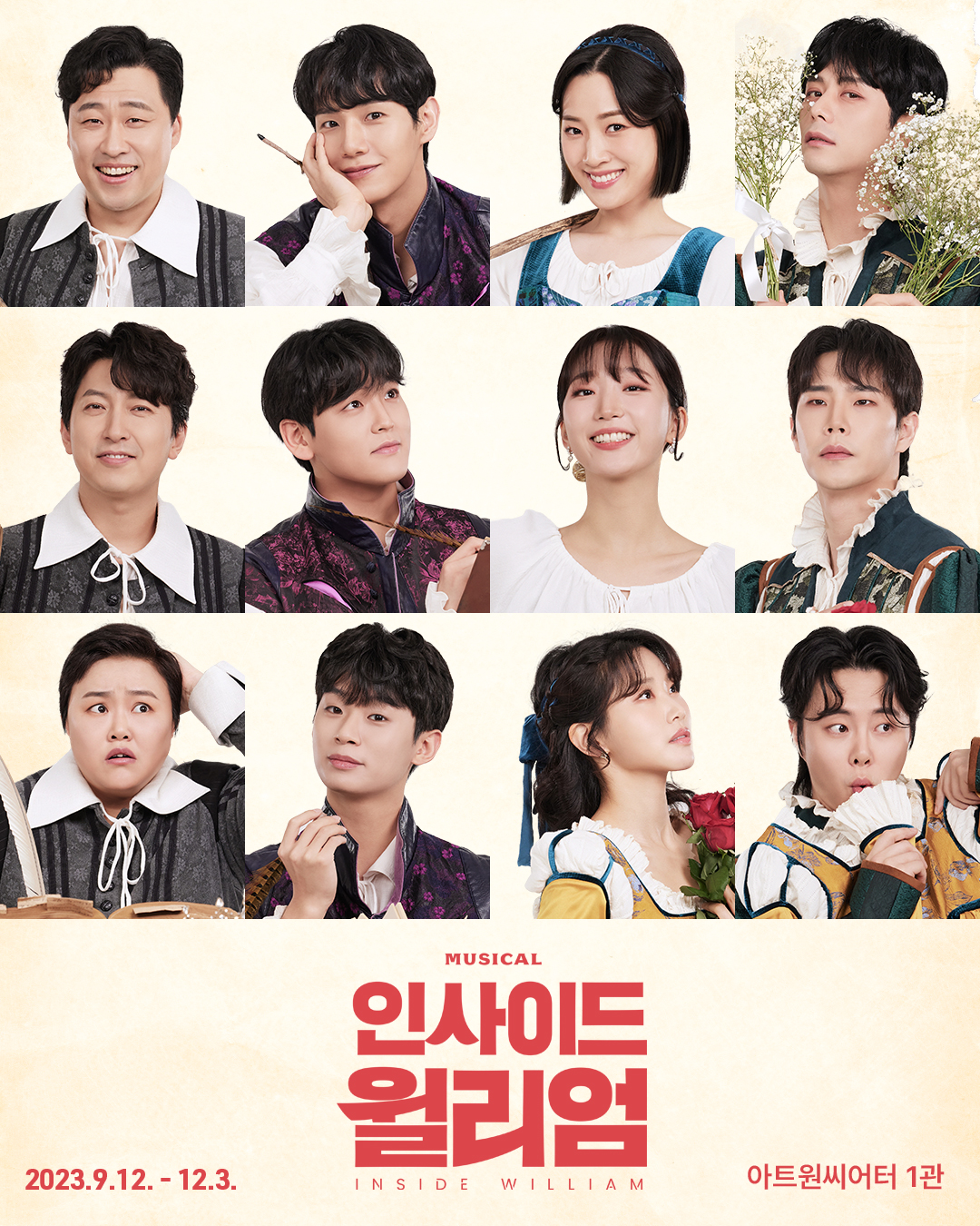 12명의 개성 넘치는 실력파 배우들과 베테랑 연출가 김동연 그리고 자신들만의 작품세계를 구축 해 가고 있는 김한솔 작가와 김치영 작곡가가 함께하는 '인사이드 윌리엄'은 오는 9월 12일부터 12월 3일까지 대학로 아트원씨어터 1관에서 공연된다.