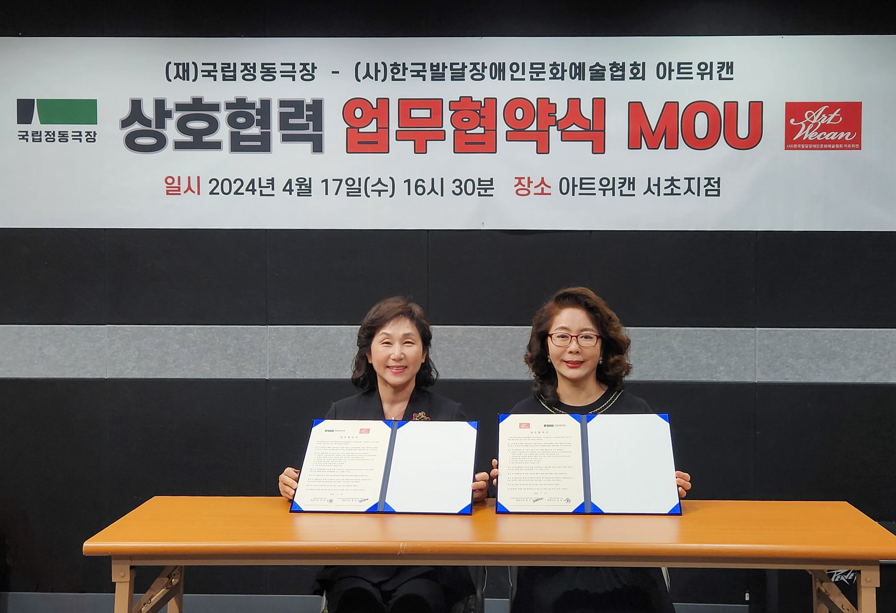 (재)국립정동극장(대표이사 정성숙)과 (사)한국발달장애인문화예술협회 아트위캔(대표이사 왕소영, 이하 아트위캔)은 지난 17일 서울 서초구 소재 아트위캔 사무실에서 발달장애인의 문화예술 활동 지원 활성화를 위한 MOU를 체결했다.