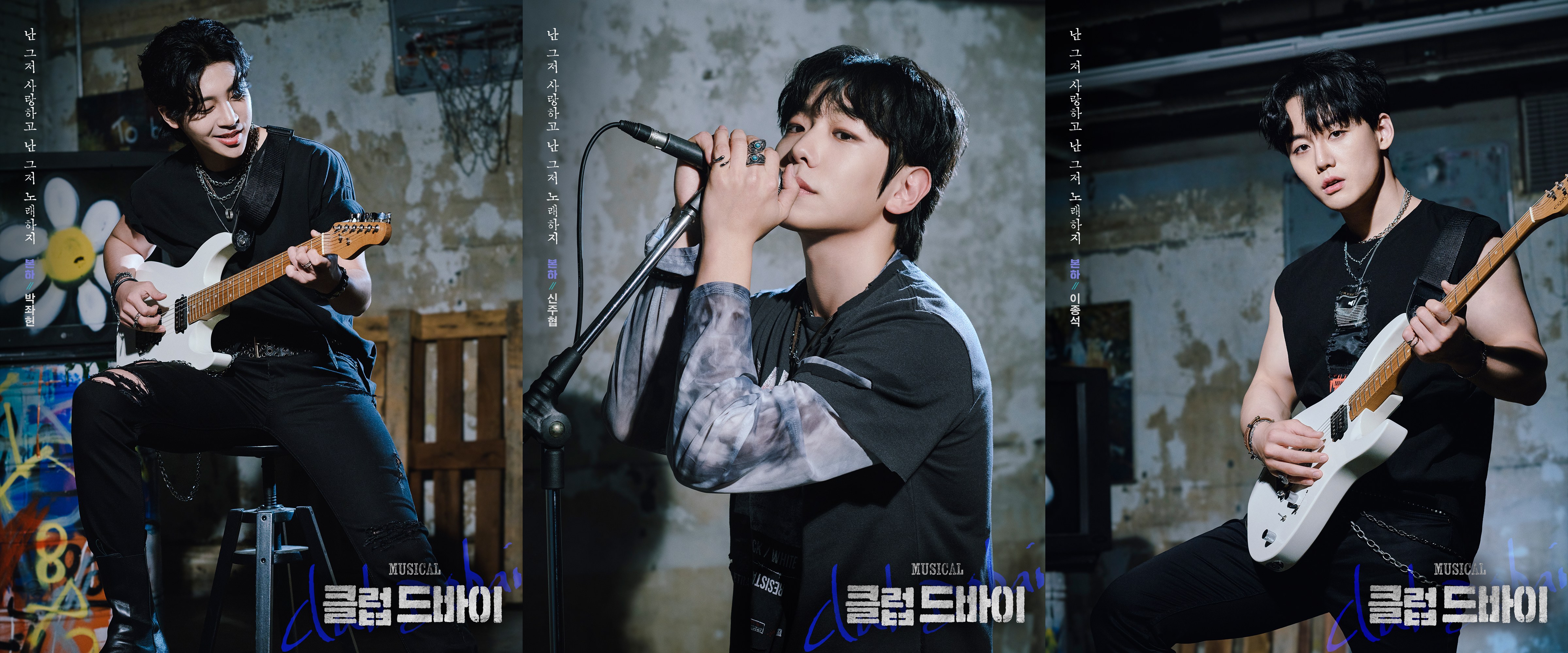 ‘도원’ 역의 변희상, 유태율, 황민수는 강렬한 붉은색 벽에 낙서가 그려진 그라피티를 배경으로 각기 다른 포즈로 기타를 손에 들고 여유로운 표정을 지으며 카리스마 넘치는 클럽 마스터이자 기타리스트를 표현했다. 극중에서 어떤 모습으로 관객들을 만나고, 공연을 선보일지 기대감을 높인다.